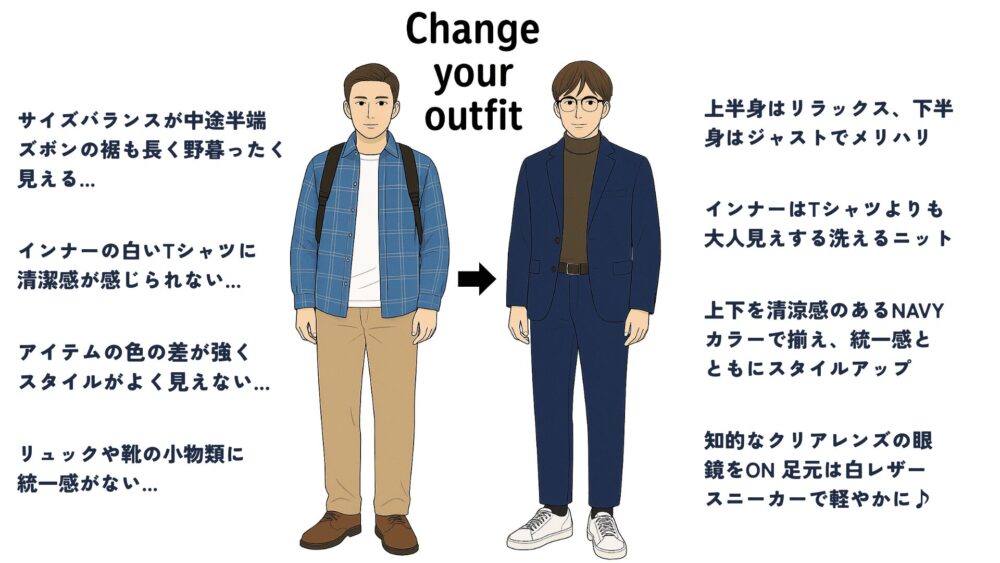 婚活パーティーを楽しめたようで何よりです!グリーンレーベルの上下セットアップを軸に、程よいリラックス感のあるコーデになりましたね。