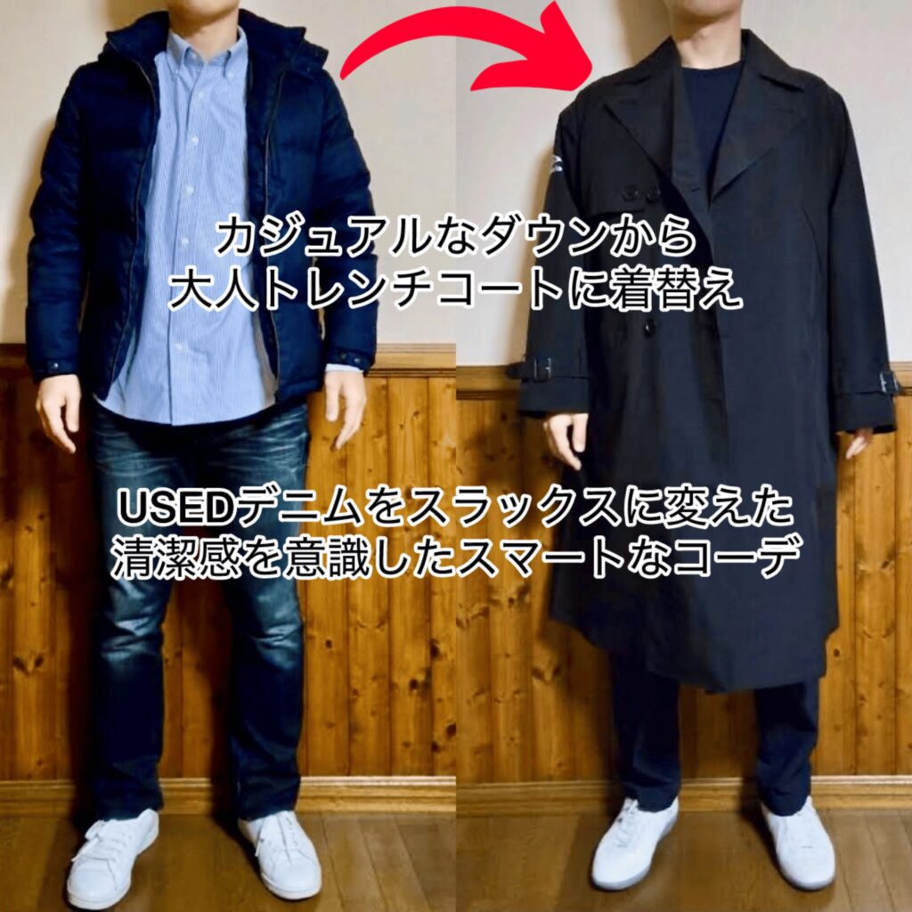 20代から愛用するダウンジャケットを、オンオフ使えるトレンチコートに変更。