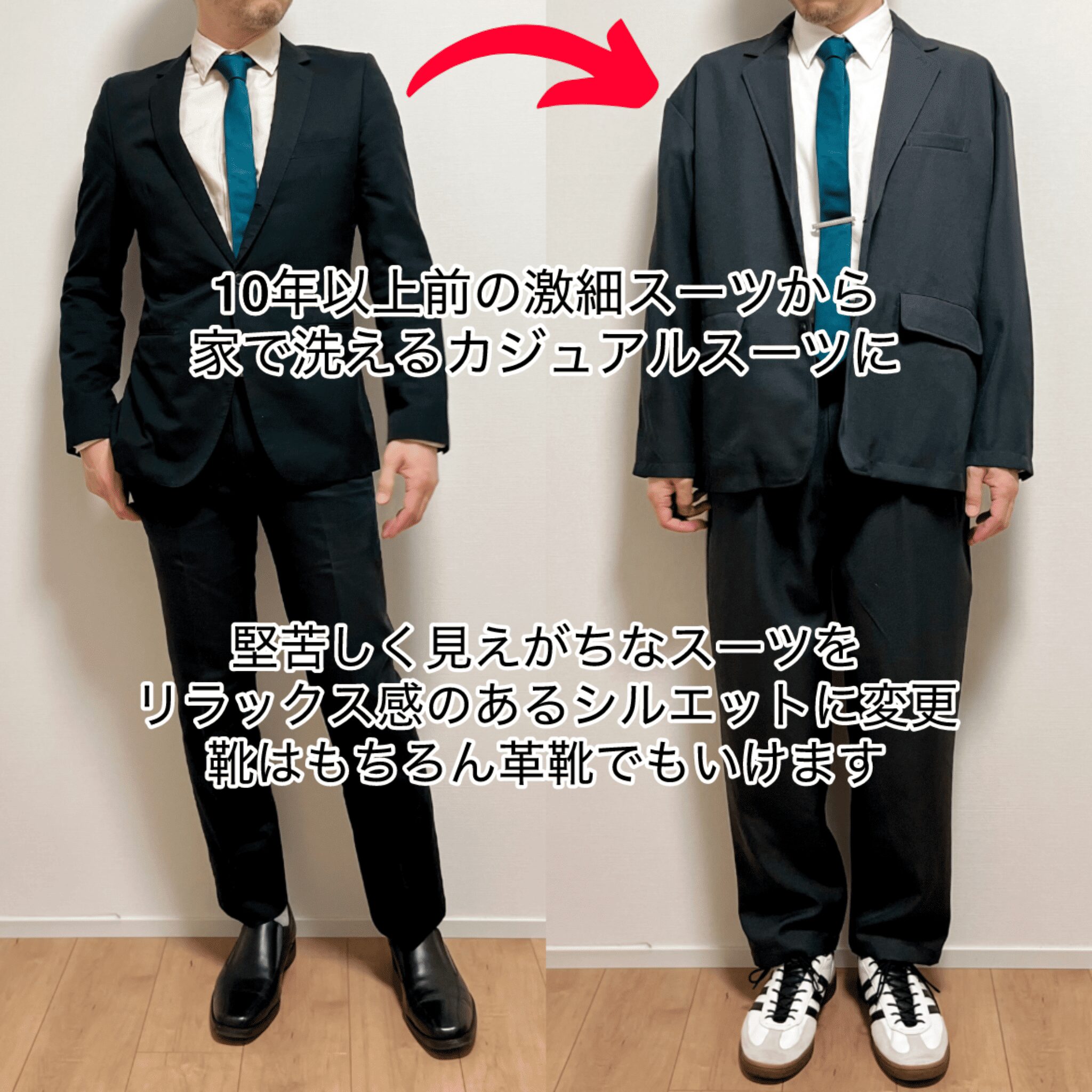 ネクタイなど、活用できるアイテムは残し、現代的にアップデート。スニーカーを革靴に履き替えれば、仕事着にも行けますね!